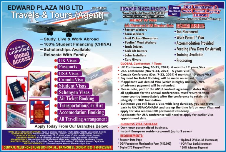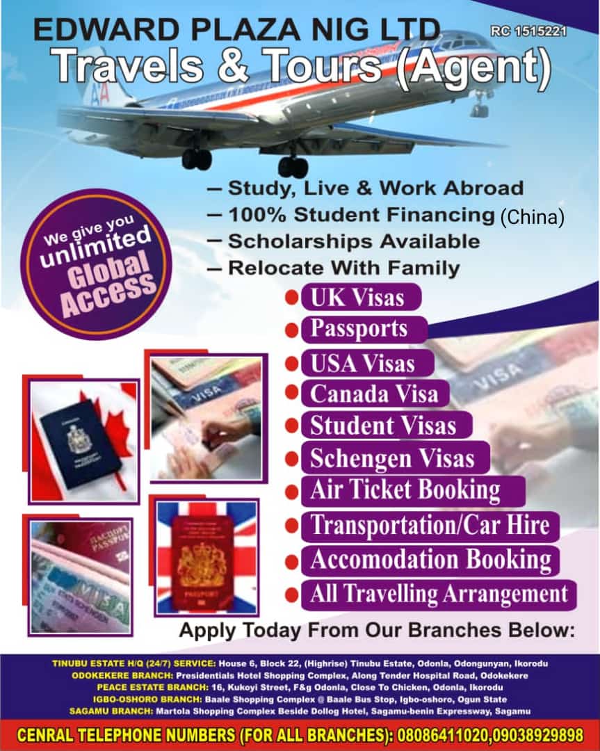 Opportunities Edward Plaza Nig LTD TRAVEL Opportunity Study, Live and Work Abroad100% Student Financing (China)Scholarship AvailableRelocate With Family Call: 08086411020, 09038929898